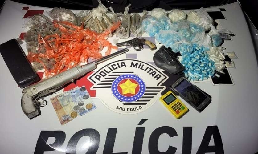 Um homem de 46 anos foi preso pela Polícia Militar pelos crimes de tráfico de entorpecentes e porte ilegal de armas, na última segunda-feira (16/10), no centro de São Sebastião. Foram apreendidas 1,1 mil porções de drogas (maconha e cocaína), duas armas, celular e uma máquina de cartão.