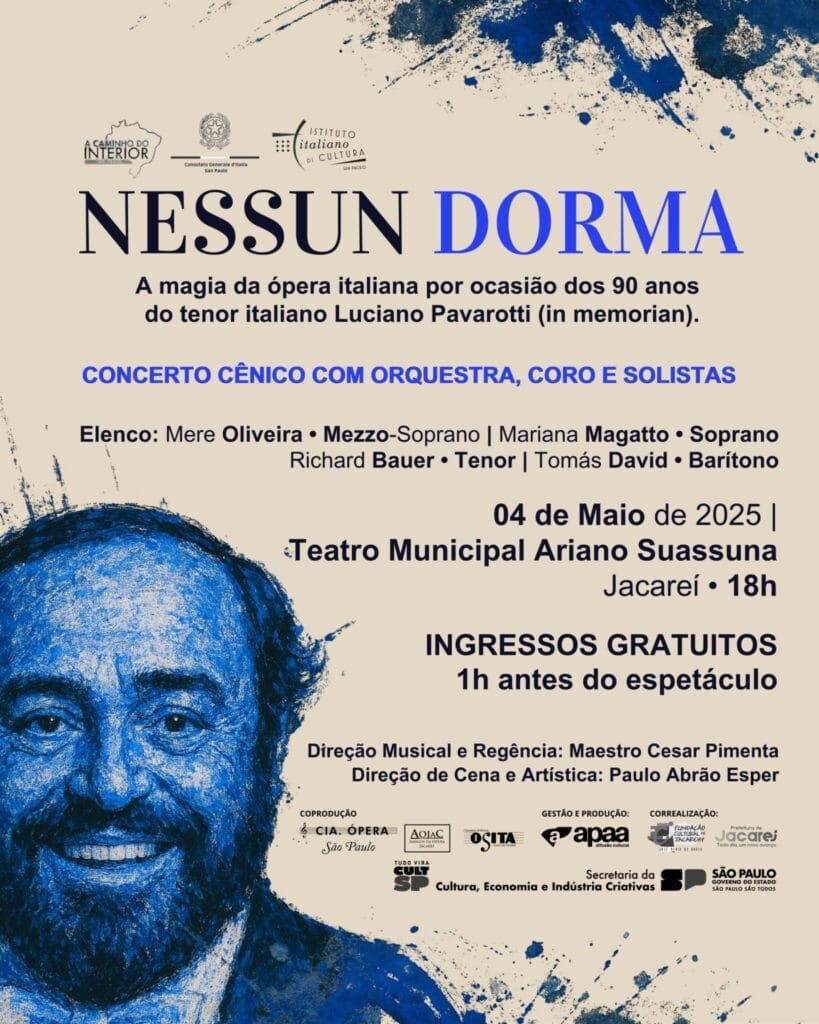 O Teatro Municipal Ariano Suassuna, em Jacareí, será palco de uma noite especial neste domingo (4), às 18h, com a apresentação do espetáculo “Nessun Dorma – A Magia da Ópera Italiana”, parte da turnê 2025 do projeto “A Caminho do Interior”.