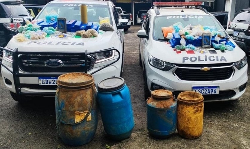 Também foram apreendidos diversos apetrechos para embalar drogas. A PM recebeu a denúncia sobre o armazenamento de entorpecentes e solicitou apoio da Polícia Ambiental por se tratar de uma área de mata.