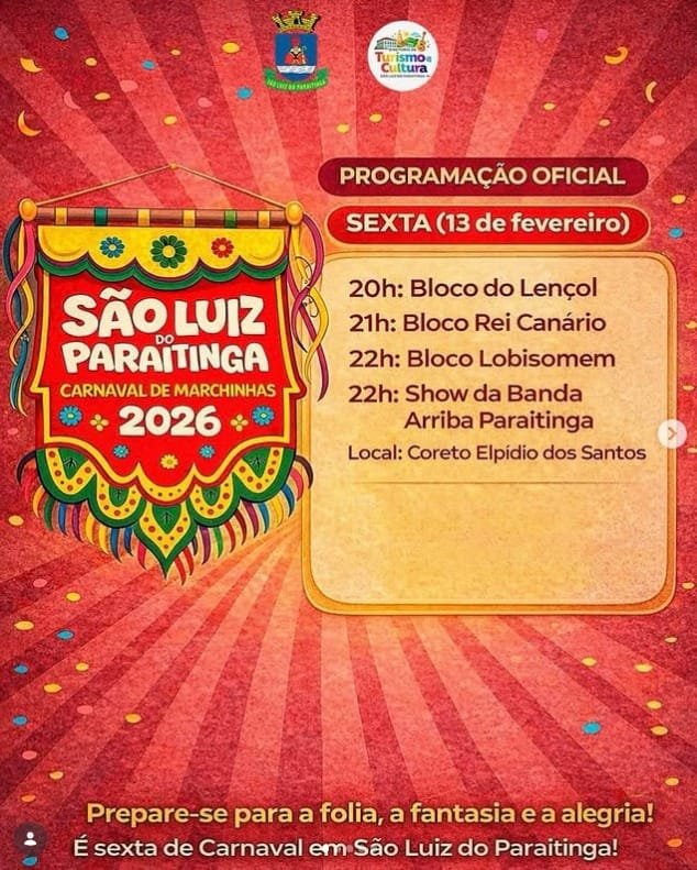 A abertura acontece na sexta-feira (13), a partir das 20h, com o tradicional Bloco do Lençol, seguido pelos blocos Rei Canário e Lobisomem. A noite será encerrada com apresentação da banda Arriba Paraitinga.